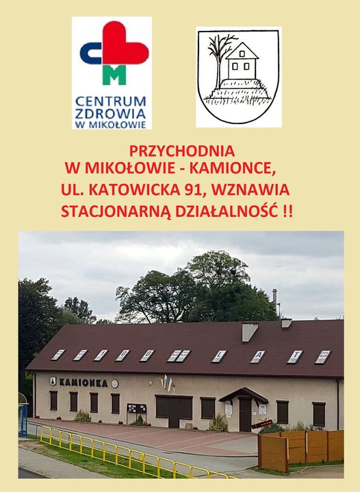 Przychodnia w Mikołowie-Kamionce, ul. Katowicka 91 wznawia stacjonarną działalność diagnostyczną!!! Zarząd Centrum Zdrowia w Mikołowie dzięki ścisłej i znakomitej współpracy z przedstawicielami Rady Dzielnicy Mikołów – Kamionka postanowił wznowić działalność Poradni. Dzięki temu dla wielu mieszkańców Kamionki dostępność do podstawowej opieki zdrowotnej będzie usprawniona. SERDECZNIE ZAPRASZAMY !! Harmonogram pracy poradni: • środa: 8.00 – 12.00 • piątek: 14.00 – 18.00 Telefon: 32 226 25 69