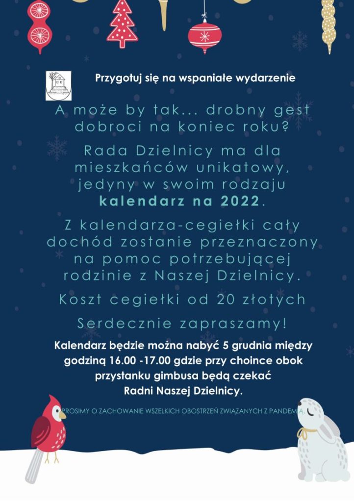 W niedzielę 5 grudnia br., podczas spotkania ze Świętym Mikołajem, w godz. 16.00-17.00, przy choince na rondku, przedstawiciele Rady Dzielnicy Kamionka będą czekali z wyjątkowym, jubileuszowym kalendarzem “Kamionka wczoraj i dziś”, kalendarzem – cegiełką, z którego dochód zostanie przeznaczony dla potrzebującej rodziny z Naszej Dzielnicy.